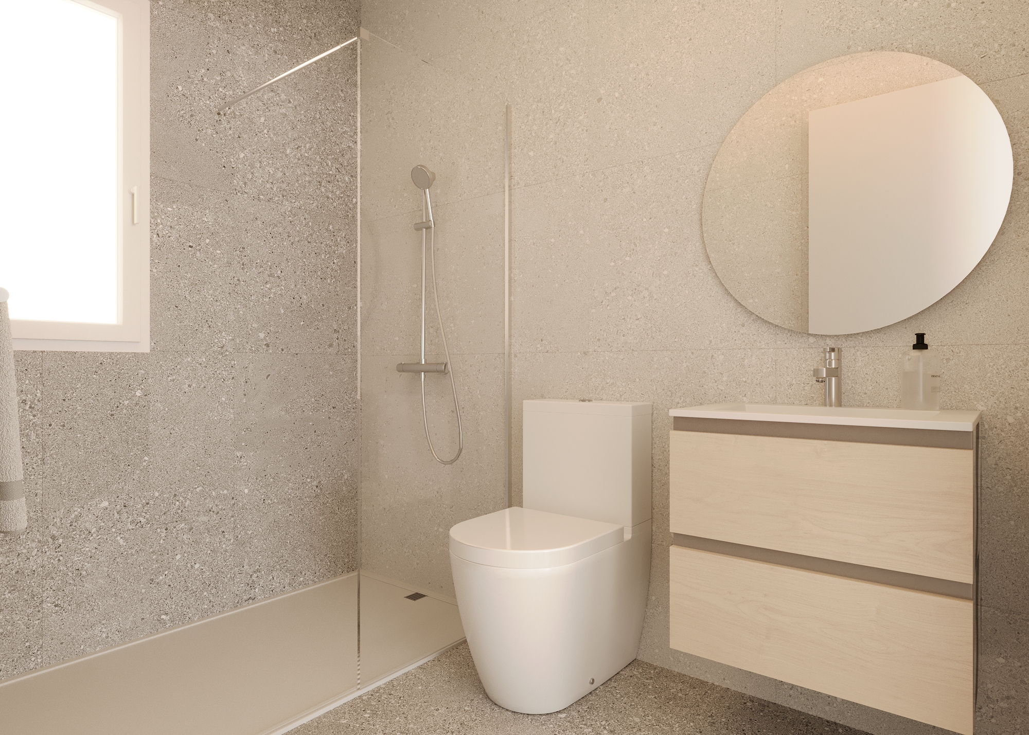The development offers detached villas with 4 bedrooms and 3 bathrooms, as well as semi-detached villas with 3 or 4 bedrooms and 2 or 3 bathrooms, all distributed over two floors. Each home features a modern, open-plan layout combining the living room, dining area, and kitchen into a single bright space, with large windows providing direct access to the terrace and garden. The ground floor also includes a double bedroom, a full bathroom, and a guest toilet. The remaining bedrooms — one with an en-suite bathroom — are located on the upper floor.