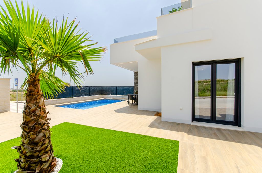 Nouveau développement de villas individuelles dans le quartier résidentiel de Vistabella Golf, sur la Costa Blanca Sud. Un emplacement à l’intérieur des terres, entouré d’orangeraies, mais à seulement 15 minutes des plages d’Orihuela Costa et de Torrevieja. Le resort dispose d’une zone commerciale avec un supermarché, une pharmacie, un club social, des restaurants et des installations sportives, ainsi qu’un parcours de golf de 18 trous. La ville de Los Montesinos se trouve à 10 minutes de la station, ce qui complète la gamme de services avec tout ce dont vous pourriez avoir besoin. Les deux impressionnants centres commerciaux d’Habaneras (Torrevieja) et de Zenia Boulevard (Orihuela Costa) ne sont qu’à 15 et 20 minutes respectivement. En outre, la liaison rapide avec l’autoroute AP-7 permet d’accéder aux principales villes de la région et à l’aéroport d’Alicante en moins de 45 minutes. Une opportunité d’investissement parfaite pour lces oalles de bains avec possibilité de construire un solarium moyennant un coût supplémentaire. Le rez-de-chaussée comprend un grand séjour ouvert avec un coin repas et une cuisine, qui s´ouvre sur une terrasse spacieuse, partiellement couverte. On y trouve également une chambre double et une salle de bains. Au premier étage, il y a deux chambres à coucher en suite avec salle de bain, dont l´une a une terrasse donnant sur le jardin et la piscine.